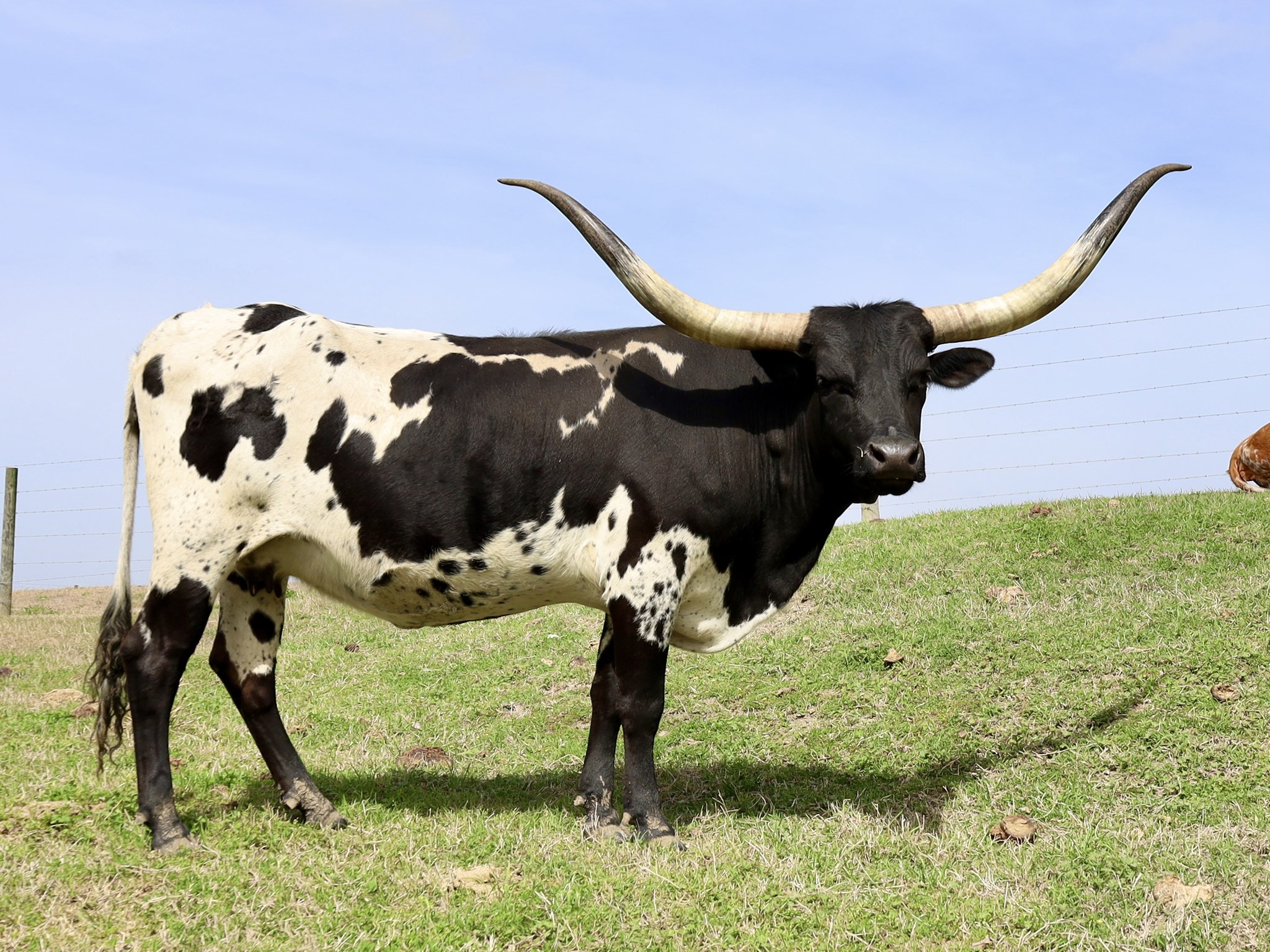 Plum Pepper was our largest 2020 heifer calf. Her lineage includes LLL Lucky, double dose of Maximus ST, CB Little Sure Shot, Plumb Line, Over Kill and Awesome Alamo. We love her black and white coloring and are very excited to see her continue to fill out and develop. She is a doting mother and bred back in 11 months!