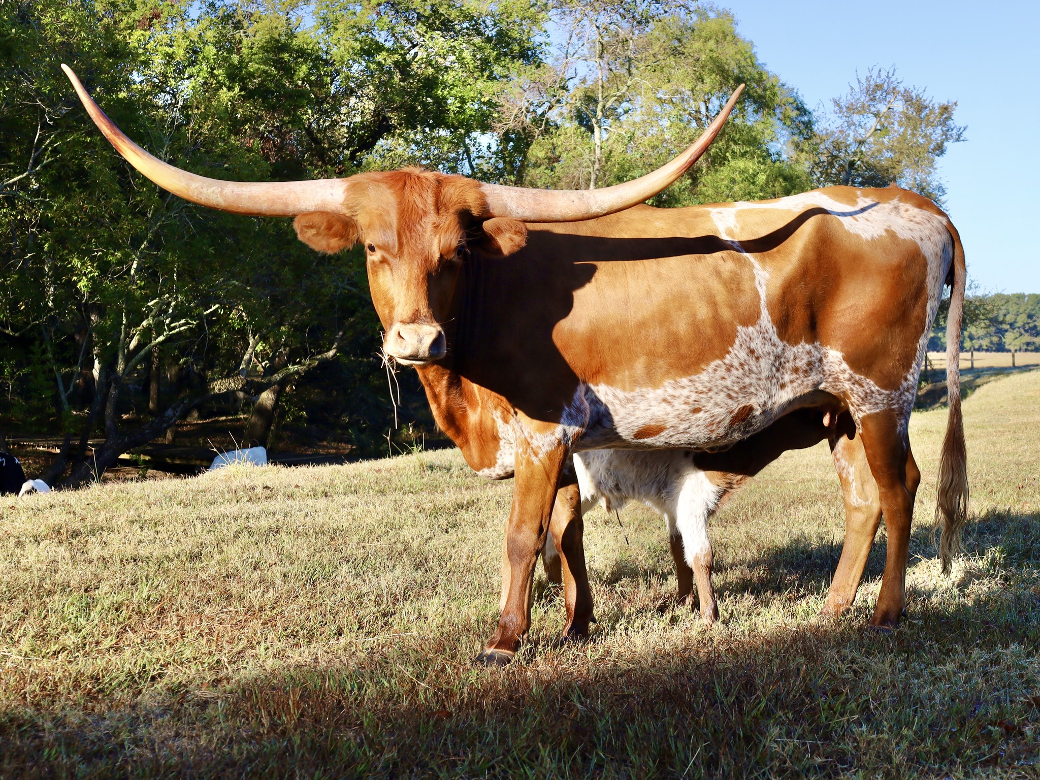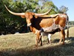 Wow! We cannot say enough about this calf from a first-time heifer! She is thick, big-boned and fiery! Luckily, we were able to halter train her for a bit and that greatly improved her disposition. She was 57" TTT at 23 months, so she going to have some nice horns to go along with her stocky build. Paprika has Clear Win, Rolling Thunder, CB Little Sure Shot and Plumb Line in her pedigree. She has been exposed to DB Chard Fiddler for a Fall 2025 calf.