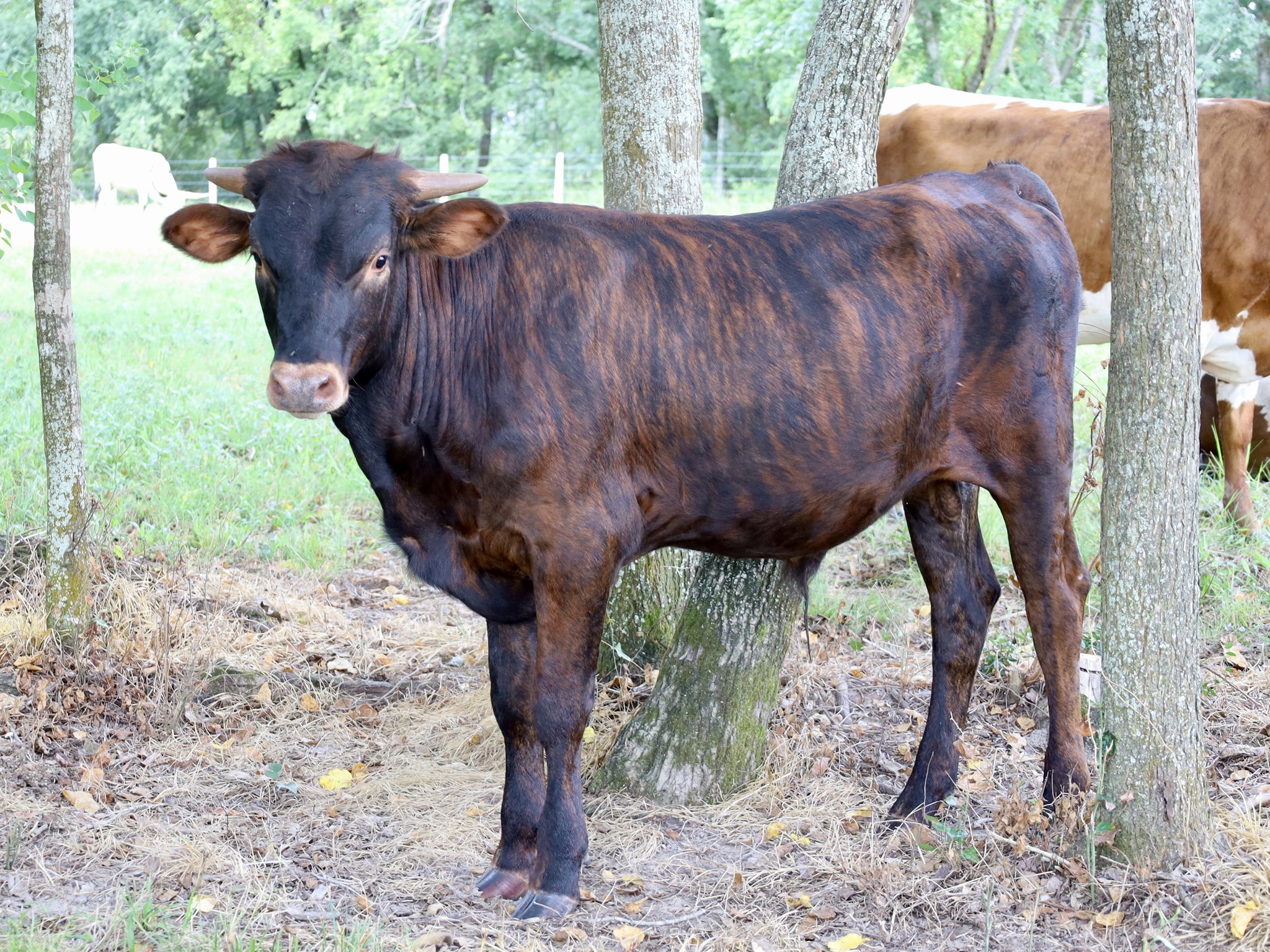 This bull calf's coloring is still changing. His face and shoulders are getting darker, and his dark brindle almost looks black in low light. His breeding combines old school and new school genetics. This mating had a breeding coefficient of 1.2. His breeding includes body and horn with Maximus ST, Shadowizm, Drag Iron, Chard Iron, The Shadow and Tuxedo in his pedigree. Currently, his horns are kicking back.