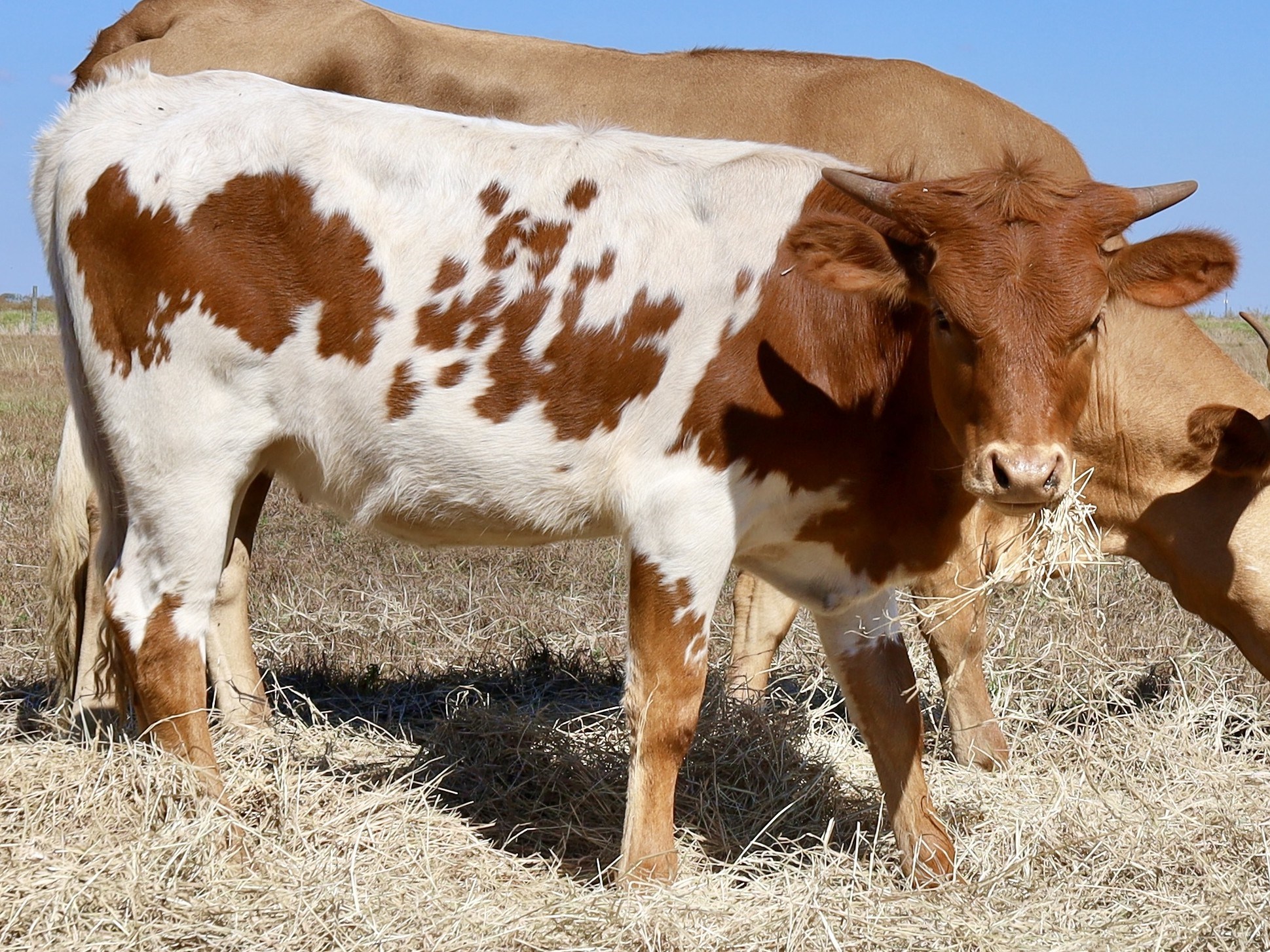 This little heifer has a nice stride, long legs, and beautiful markings. And she's inquisitive to boot! Her pedigree comes with LLL Lucky, Little Sure Shot, Chard Iron, Tuxedo, and Fiddle Sticks. We have been very happy with her dam who produces thick calves with great horn potential.