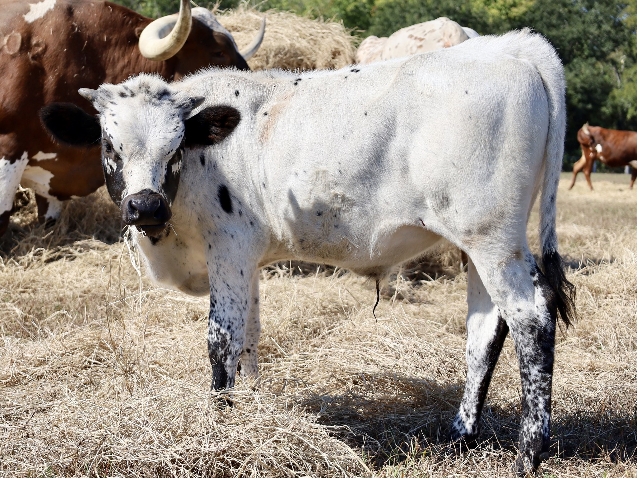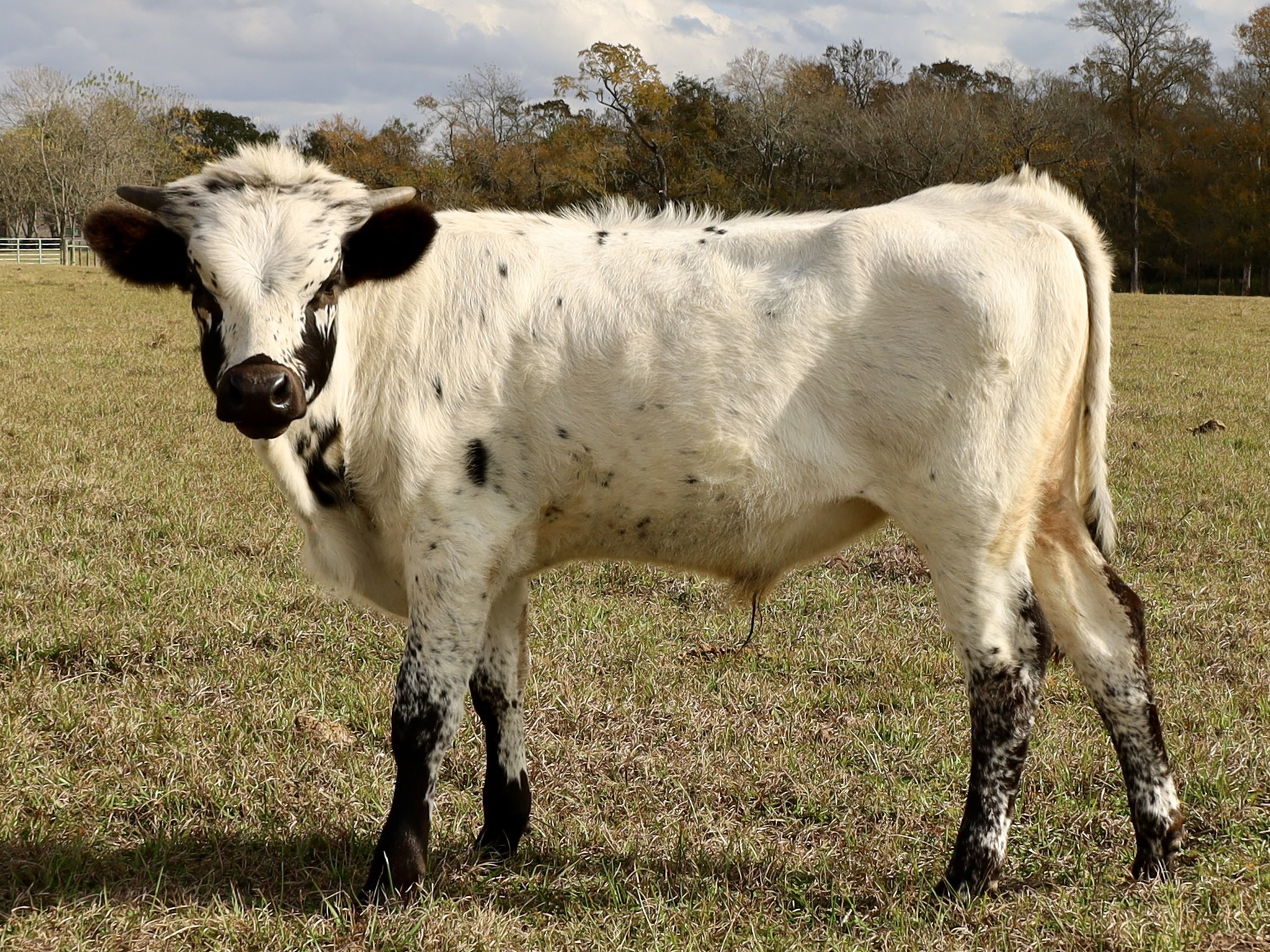This calf has a neat looking lacey face pattern, and it looks like he has spotting coming through his body too. His pedigree includes Fifty-Fifty BCB, Awesome Alamo, Top Caliber, Chard Iron and Tuxedo. This calf will be available at weaning in late December.
