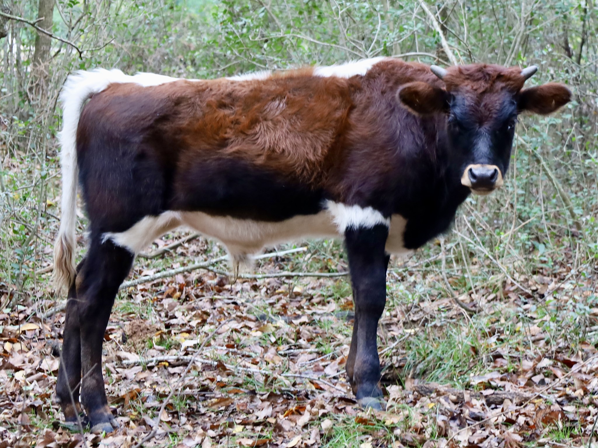 This calf was a BIG boy the day he was born! With his black nose and the tip of his tail switch being dark, I believe this one will darken or go Parker Brown. Currently, he has blue eyes that I am sure will change later, but it makes his coloring even more unique. This calf has size and horn on both sides of his pedigree. Lots of brindle and wild color in his pedigree as well. His maternal side have great udders and are consistent calvers.